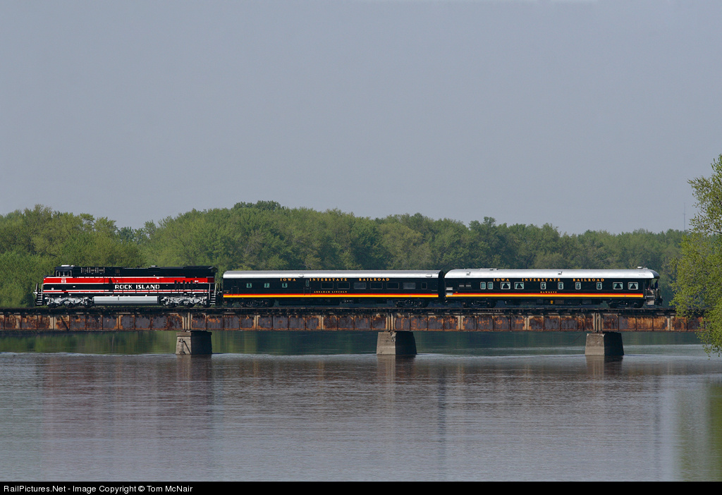 Iowa Interstate's business train crosses the Rock River at Colona. Rock Island heritage unit #513 leads the way.