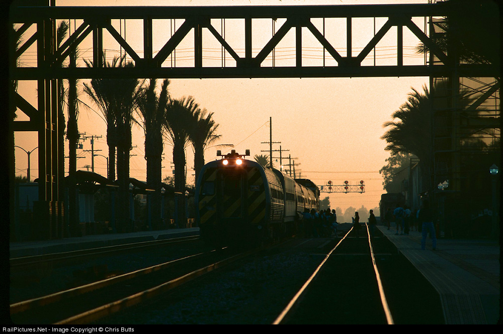 A southbound San Diegan loads passengers at Fullerton station during an August sunset. At this time, the new passenger platform for southbound trains (on the left) is not in service yet so they were still using the old platform, on this middle track.