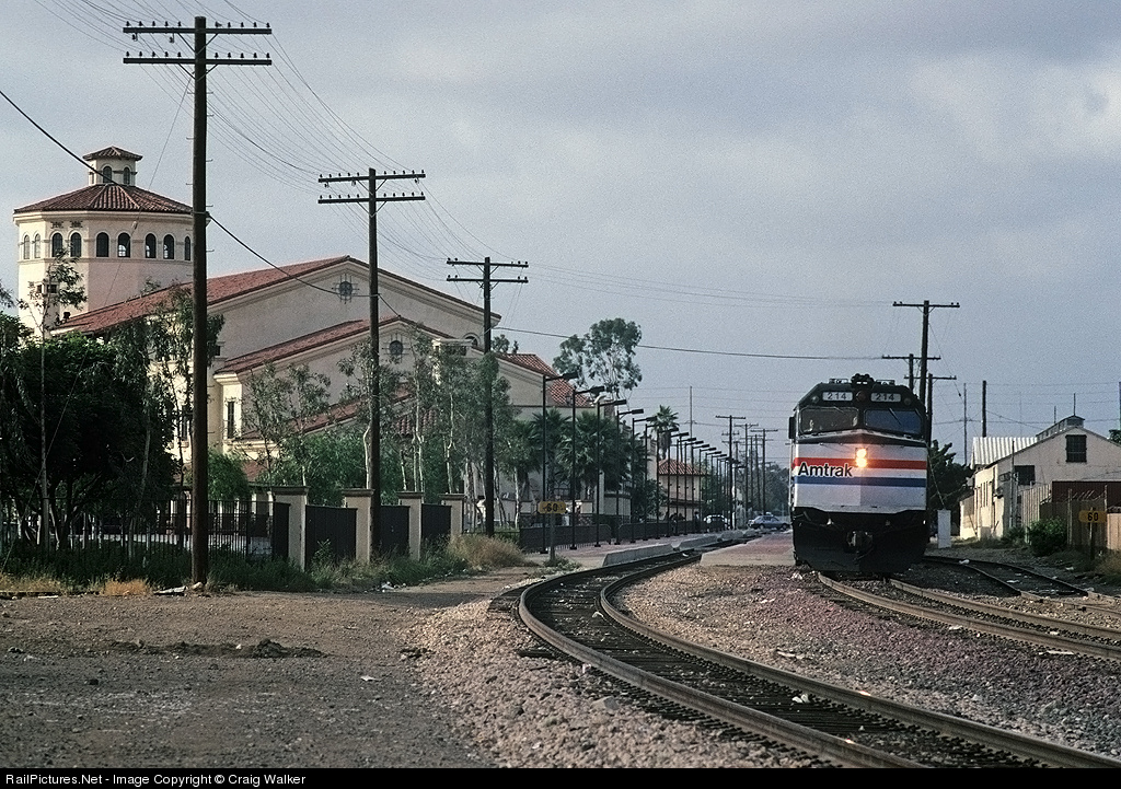 A southbound San Diegan departs Santa Ana, California, on its way to San Diego in May 1989. The Santa Ana Transportation Center "stood in" for Los Angeles' Union Station in the film "Rain Man."