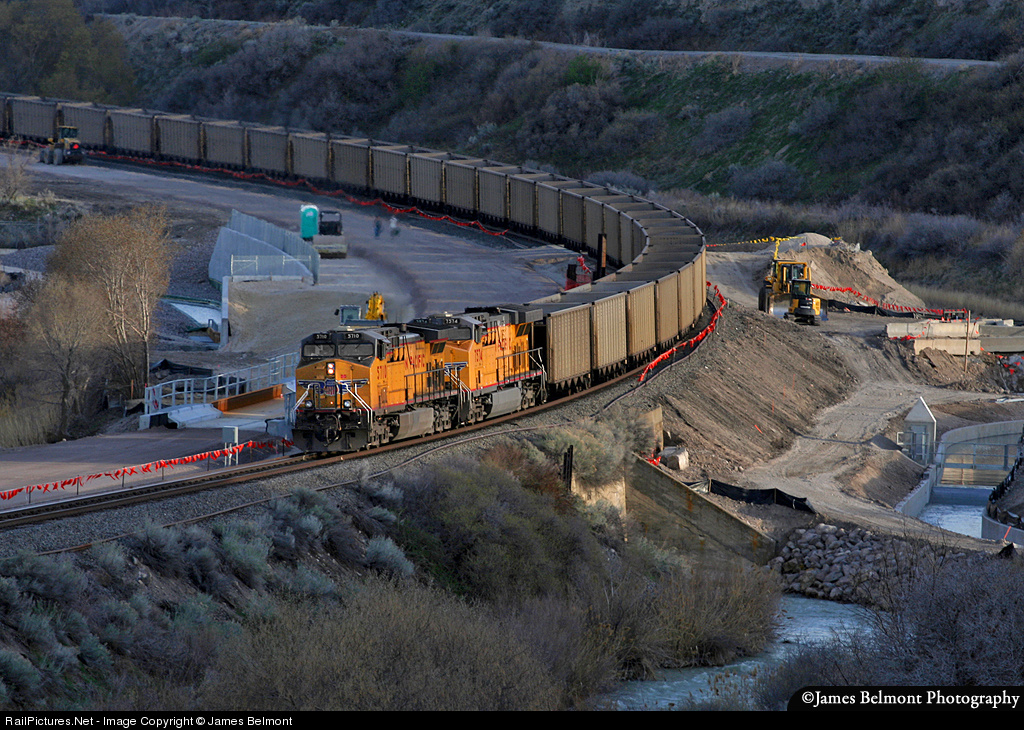While the sun drops behind the Oquirrh Mountains, Union Pacific's Valmy to Skyline coal empty creeps slowly through a 10 mph speed restriction along UP's Provo Sub in the Jordan Narrows. Herzog, CBC, Stacy and Witbeck, Inc. construction forces are building a commuter rail line parallel to the UP between Salt Lake City and Provo. New bridges over the Jordan River and an irrigation canal are visible in this view captured at milepost 723.75. The U.S. Army Corps of Engineers have asked the Utah Transit Authority to stop construction through the Narrows while right of way concerns are resolved.
