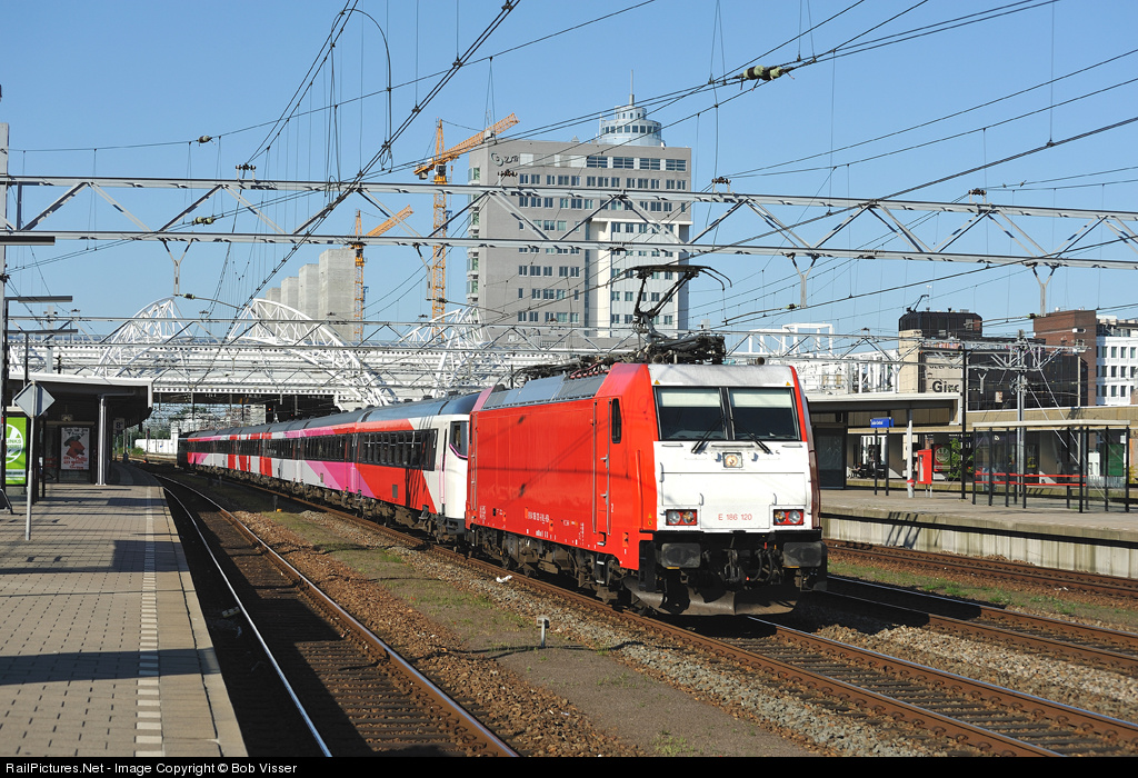 | E 186 120 rushes trough Leiden Centraal towards Den Haag, Rotterdam, Dordrecht, Roosendaal, Antwerpen, Mechelen and Brussel. |