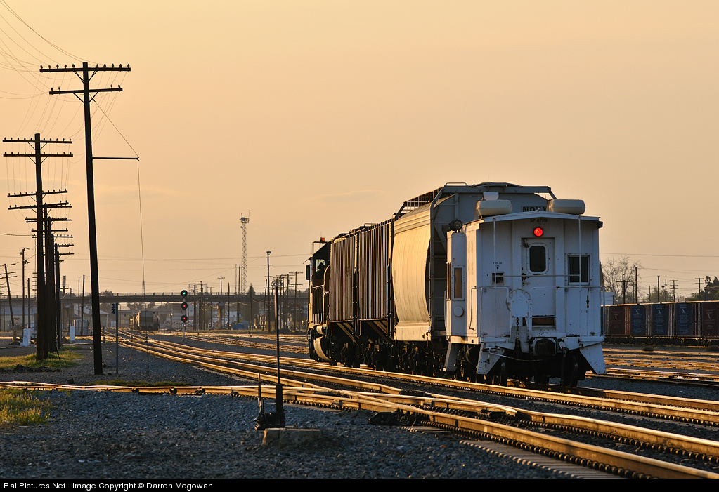 An ex. Southern Pacific Police caboose, now used as a shoving platform for this remote controlled yard job, brings up the rear as an ex. Missouri Pacific GP38-2 leads it short train toward Kern Jct. The train has just returned to Bakersfield after switching the local industries in Edison, CA, 7 miles railroad south of Bakersfield.