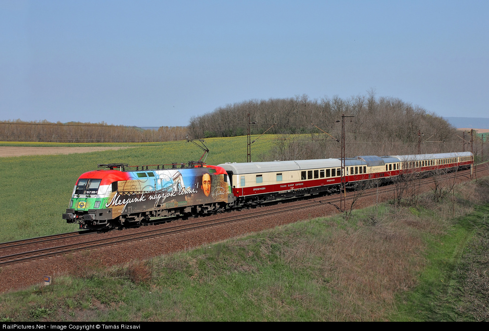 | Trans Europe Express... Rheingold specail train from Germany arrives to border of Szárliget. It came an 103 type engine until the border then the train got an other lokomotive that was the Széchényi advertisement-lok from the GySEV railway. The train came to Budapest in the morning , but backwards to Germay only afternoon. The train didn't stop at Hungary only at Budapest and the border station (Hegyeshalom). |