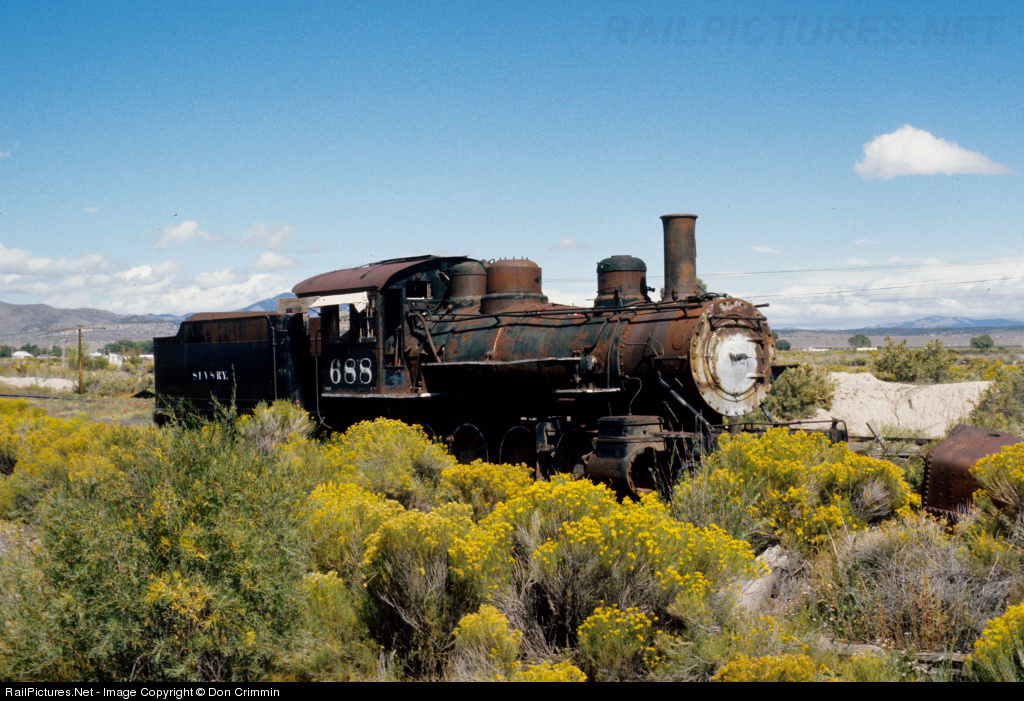 Former D&RGW standard gauge C-28 2-8-0 #688 rests in the tiny yard of the SSLV in Blanca, CO. As SSLV #105, she survived at Blanca after sister #106, ex-D&RGW 583, was moved to the Colorado Railroad Museum in 1963 and was restored to her former owner's livery. Sadly, #688 didn't survive. Her late demise halved the number of extant Rio Grande standard gauge steam locomotives to one. She would have made a nifty static display at Alamosa for the Rio Grande Scenic......