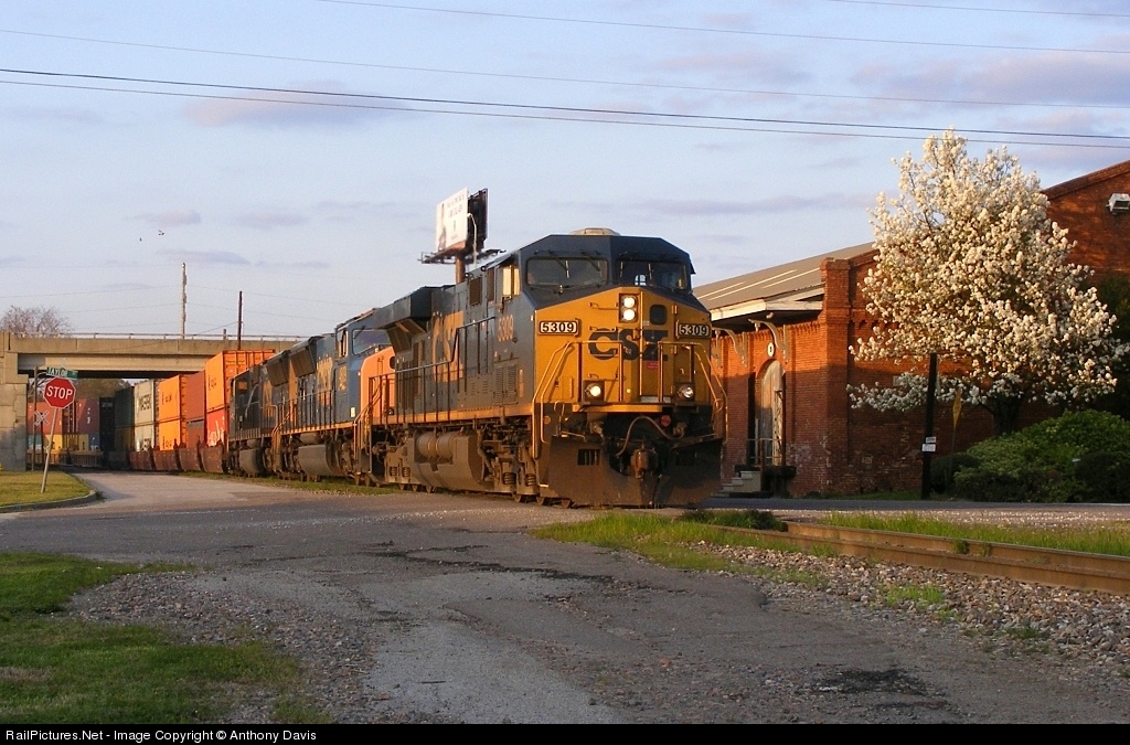 | Bearly Beating the Sun!CSX Q197-27 arrives into town, bearly beating the sun, from Atlanta on its way to Savannah. The blooming Dogwood by beside the Taylor Street Station provides for nice scenery! |