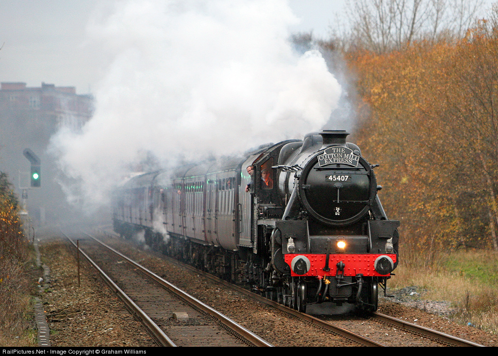 | Black Five no. 45407 approaches Moses Gate station with the Cotton Mill Express railtour. The locomotive owner can be seen leaning out of the cab. |
