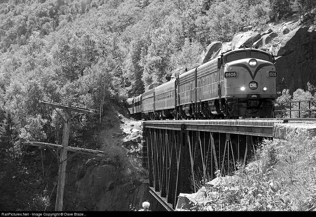 | On a Sunday morning the twin ex CN/VIA Fs perform for a throng of fans that are strung along the small shelf on the west end of the bridge high on the south flank of the Crawford Notch in the shadow of Mount Willard. This is the second day of the Conway Scenic's annual two day Railfans Weekend and the photo runbys in the Notch are always a staple of the events. These rails are the legendary former Maine Central Mountain Sub which lay moribund for more than a dozen years after Guilford shut it down in 1983. Now owned by the State of New Hampshire the Conway Scenic provides a 5 hr round trip that is arguably one of the most scenic train rides east of the Mississippi. |