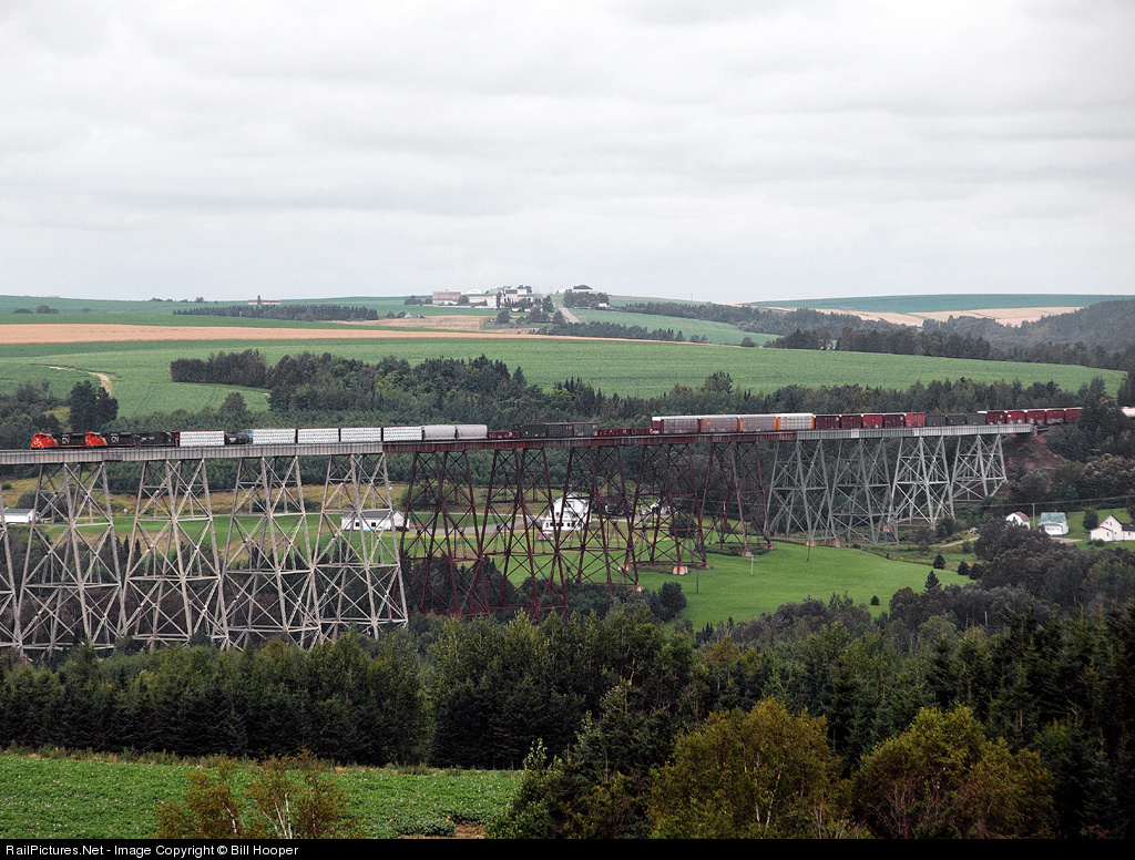 Eastbound mixed freight on CN's Atlantic main crosses the Salmon River bridge east of Grand Falls NB