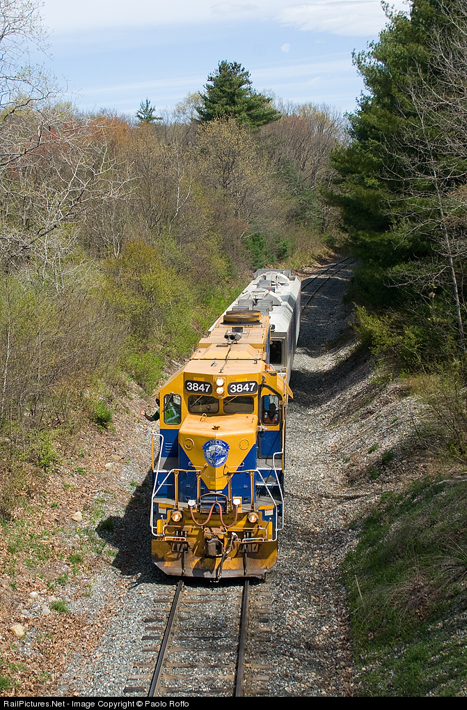 | Inspecting. With FRA personnel inspecting the track on the Palmer Sub, the test train's engineer takes a moment to inspect the photographer as he rolls under Stafford Hollow Road. |