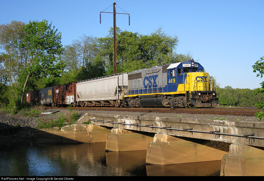 | Accelerating out of Browns Yard, CSXT GP40-2 no. 4419 crosses the South River spanning Sayreville and East Brunswick. The train is on the former Pennsylvania Railroad's (once electrified) Amboy Secondary. |