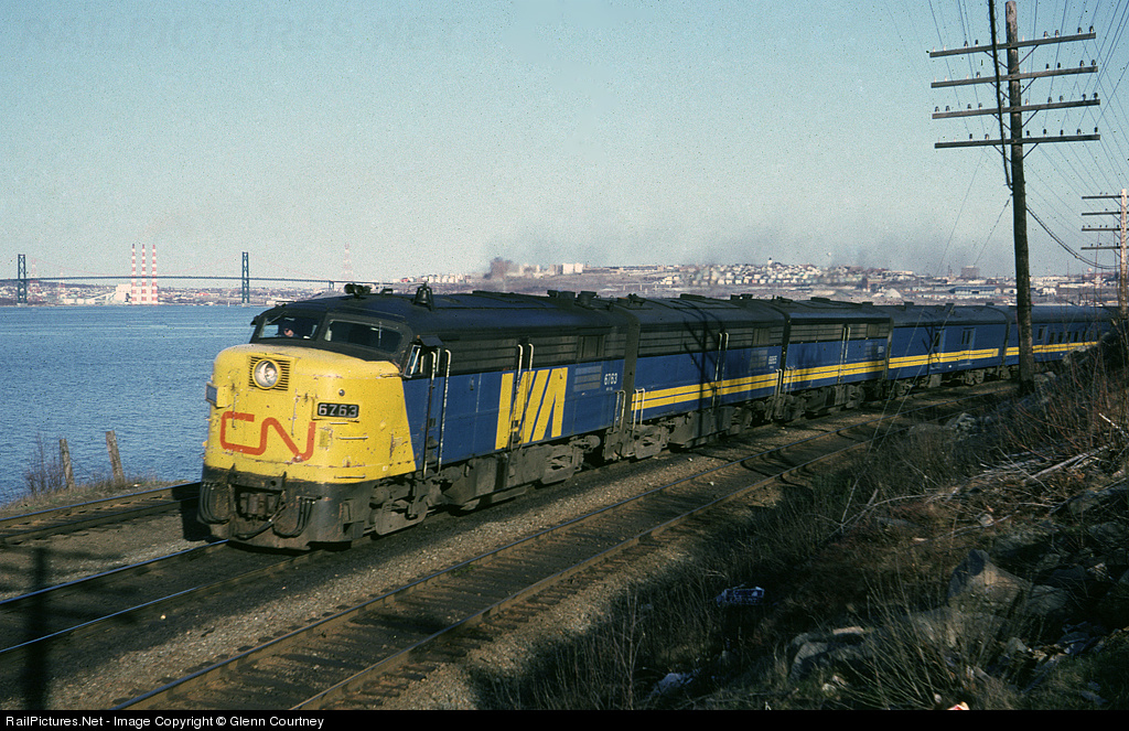 CN 6763 leads Via #15 past the west end of Rockingham yard, along the shore of Bedford Basin with the A. Murray McKay bridge between Halifax and Dartmouth in the background.