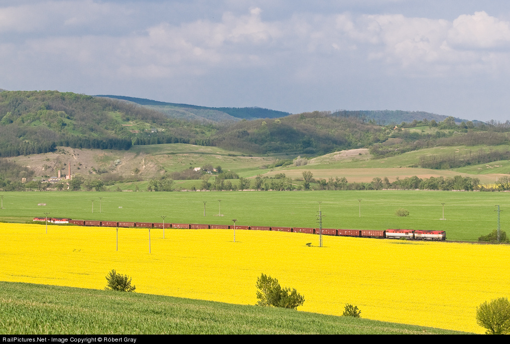 | The Fil'akovo - Somoskőújfalu frontier line moving through steep hills. Most of the loaded freight trains require helper engines to climb successfully the ascendants. The four CKD T478.1 "Bardotka" sounded like a sick tractor while moving next to this canola field. |