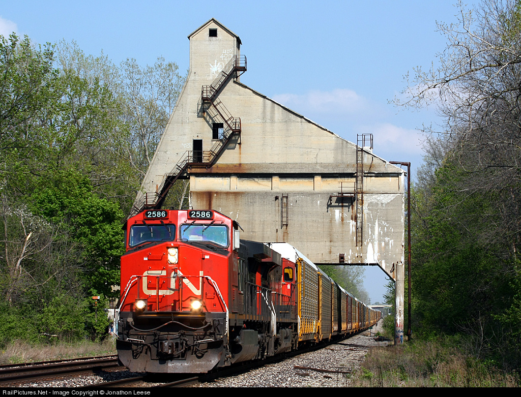 | Where GTW U class 4-8-4's once paused for coal, CN freights now roll through without stopping. A westbound CN freight passes under the old Grand Trunk Western coaling tower in Lansing, MI. Special thanks to Gregg Pullano for letting me use his 70-200L lens. |