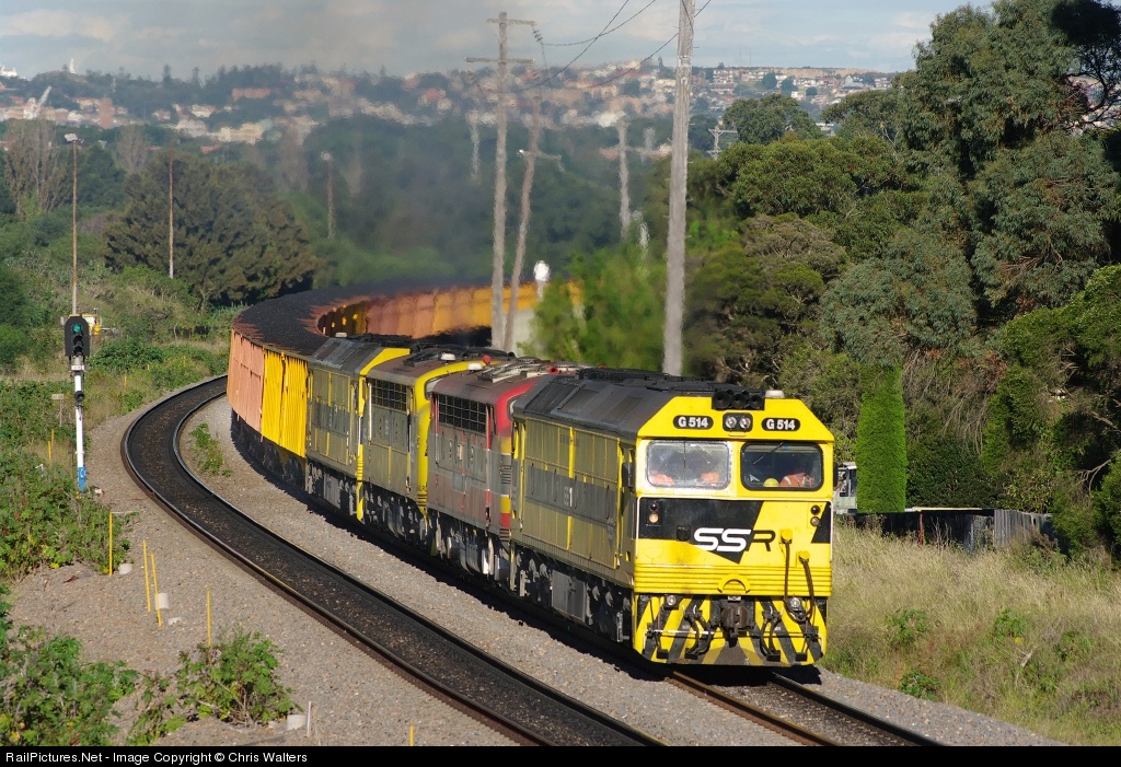 G514, B65, B61 and G513 are approaching the Maud Street overpass near Mayfield West, with a Southern Shorthaul Railroad coal train from Newstan bound for Kooragang Island.