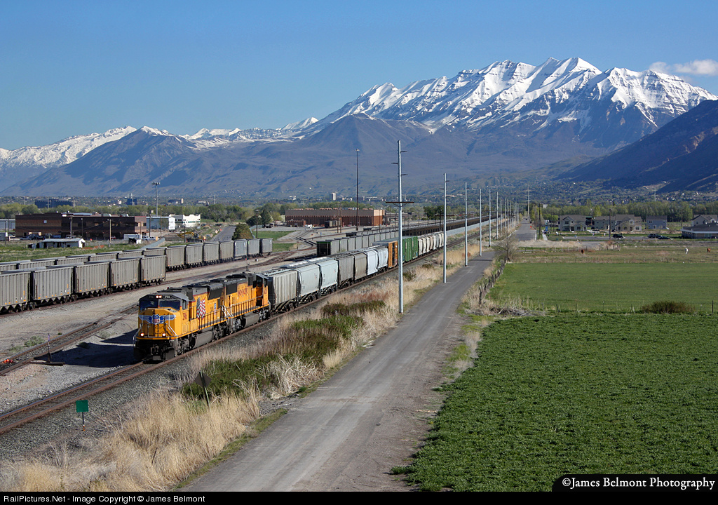 UDOT opened a brand new overpass across UP's Sharp Sub at 4th South in Springville, Utah. Benefiting from the new elevated perspective we witness UP's LUL57 'Lynndyl Local' breezing by the Intermountain Power Project Railcar Service Center west of town. Snowy 11,749 ft. Mt. Timpanogos looms over the cities of Provo, Orem, and Pleasant Grove.