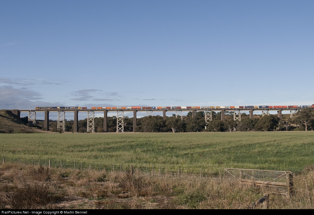 NR117-XRB561-NR20 are dwarfed by the 392m long Moorabool Viaduct near Geelong, Victoria.