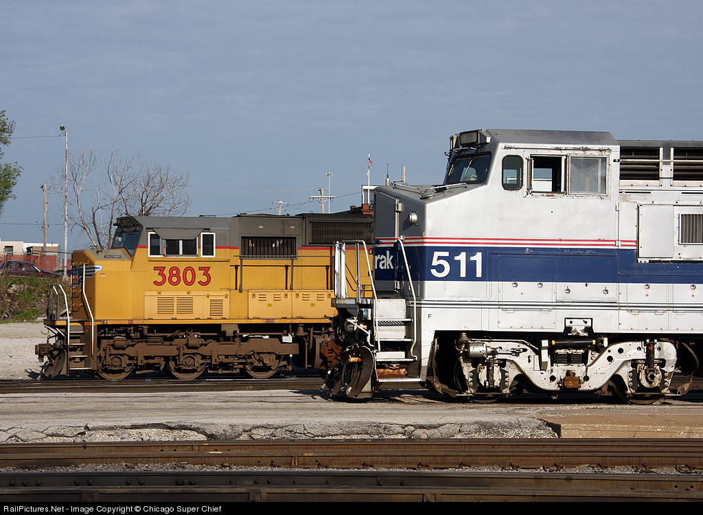 Amtrak 511 sits around outside the wheel truing shop, while UP 3803 moves light (with two sisters, out of view) through the Canal Street Wye.
