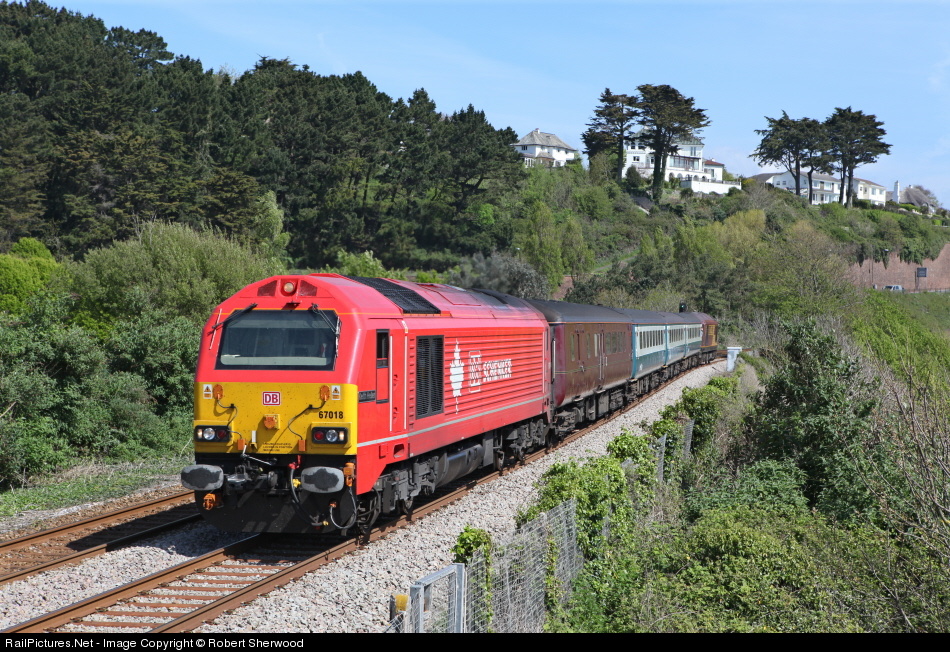 | 67018 hauls 2C67 08:00 Cardiff Central – Paignton service past Hollicombe Gas Works on Monday 10th May 2010. 67022 was on the rear. |