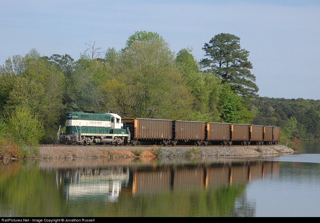 | Carolina Coastal GP16 #1721, still in it's old Aberdeen Carolina & Western paint, shoves a large cut of coal hoppers towards the shut down ALCOA Plant in Badin,N.C. where they will be placed into storage. Another big string would be brought out of storage later in the day and taken back here to Whitney where they would be interchanged with the Winston-Salem Southbound Railway. The train is traveling through the beautiful scenery along the shores of Badin Lake! |