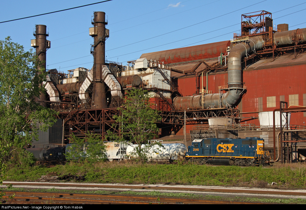 CSX 2546, wearing newly acquired Dark Future paint, works the hump in front of the idle basic oxygen furnace of Mittal steel.