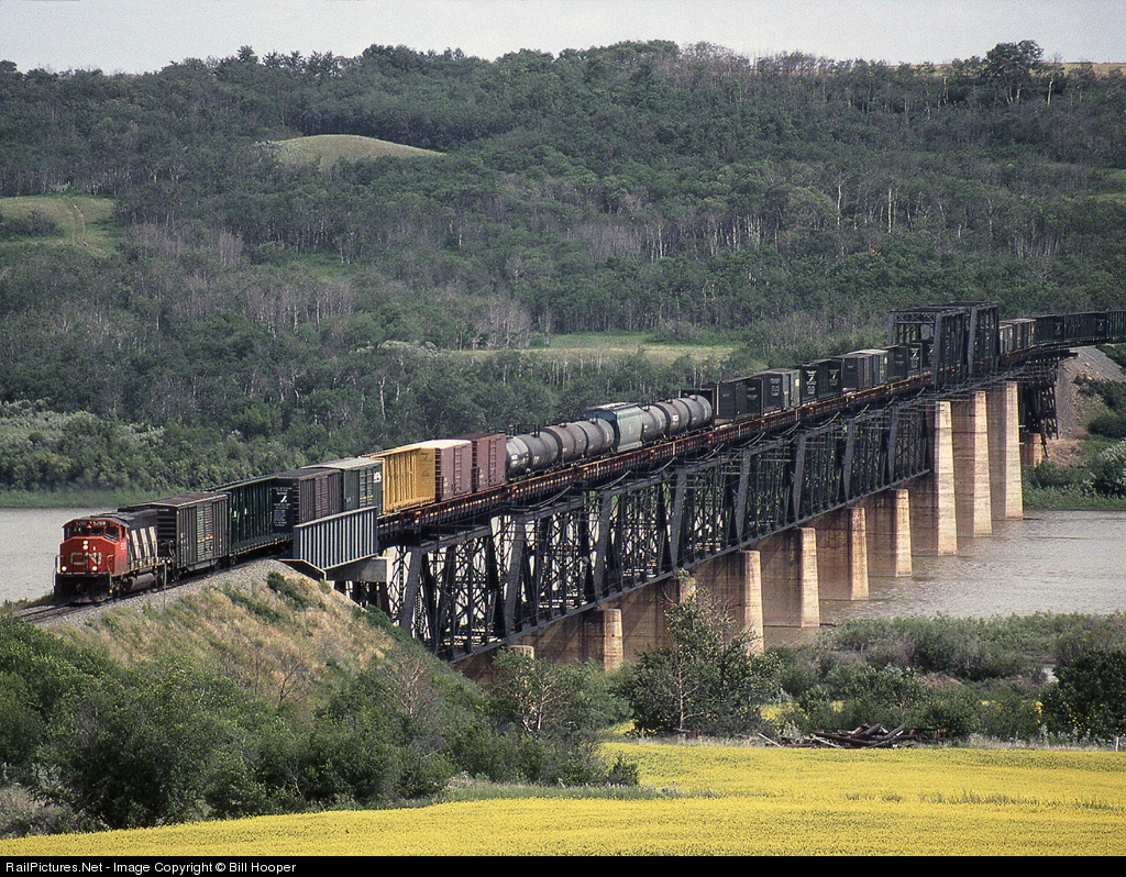 | A westbound just out of the terminal at North Battleford bound for Edmonton crosses the North Saskatchewan River on CN's PNL Line. The PNL was once the main line of CN predecessor Canadian Northern but was downgraded to secondary status in favour of the Grand Trunk Pacific line across the prairies |