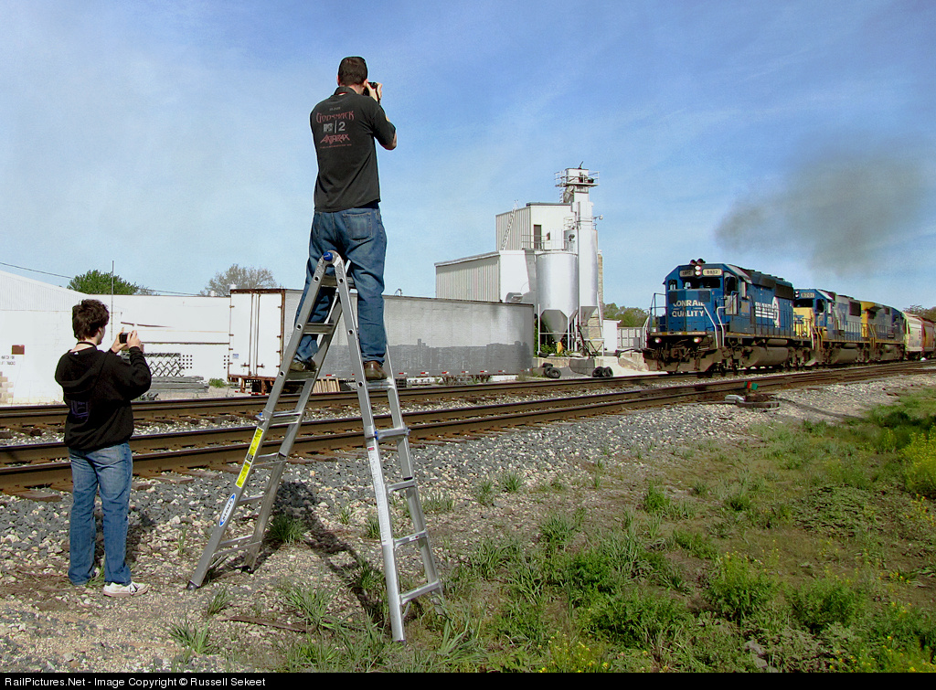 | Trevor Sekeet and Zack Segur are busy photographing Q334 which has a well worn SD40-2 still in Conrail Quality paint for lead power today. Zack is the webmaster for www.railroadfan.com which is a good site for anything rail related in Michigan and the Midwest. |