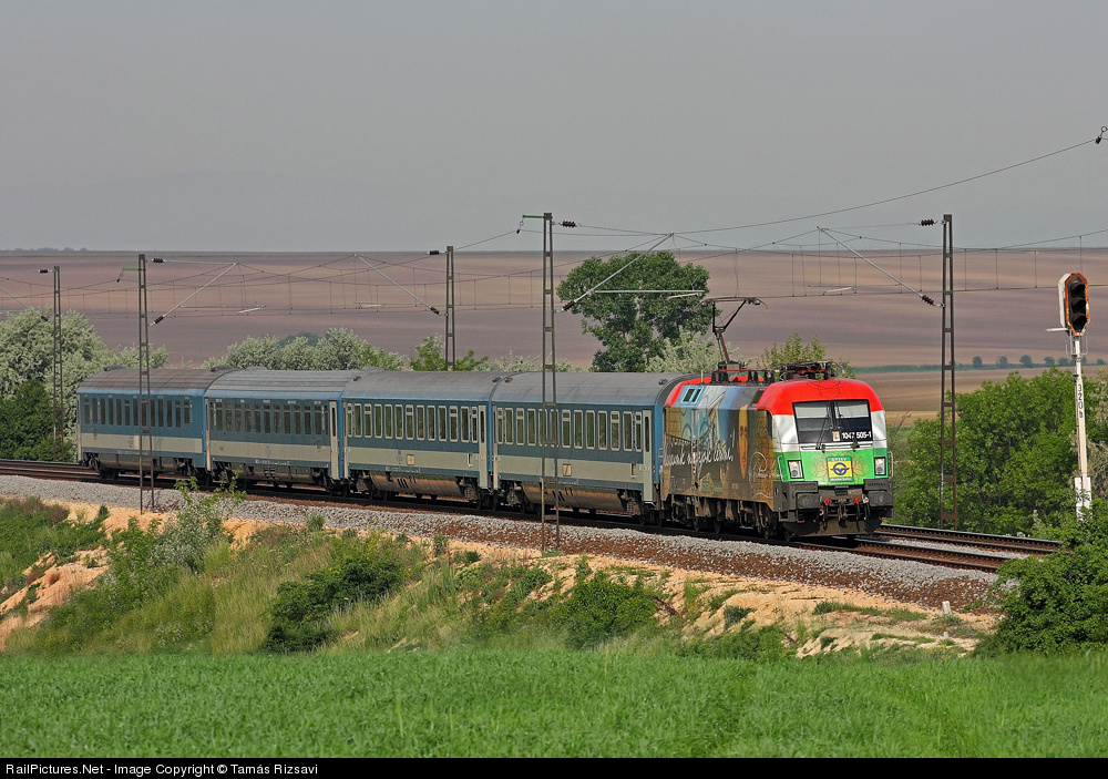 | Kálmán Imre EuroNight train goes to Budapest from Munchen main station. The GySEV zRT prepared this engine for his memory the 150. anniversary of his death. This is the 2nd advertisement engine from the GYSEV railroad. The first one is the "Haydn lok". The special engine's first way to Sopron from Budapest Keleti station with his fast train. The front of the engine is painted on the colours of the Hungarian flag. |