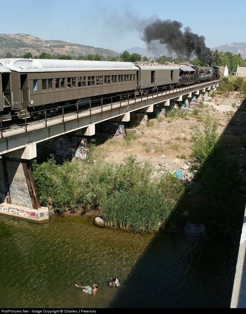 | While a teenaged couple watches from their interrupted swim in the Sespe Creek, the McCloud River #18 (2-8-2) makes its first run from Santa Paula to Fillmore, on its way to starring in the feature film "Water for Elephants." The Mikado pulled the train in order to give it a shakedown run. It is not reported to be used for other public excursions at this point in time at least. |