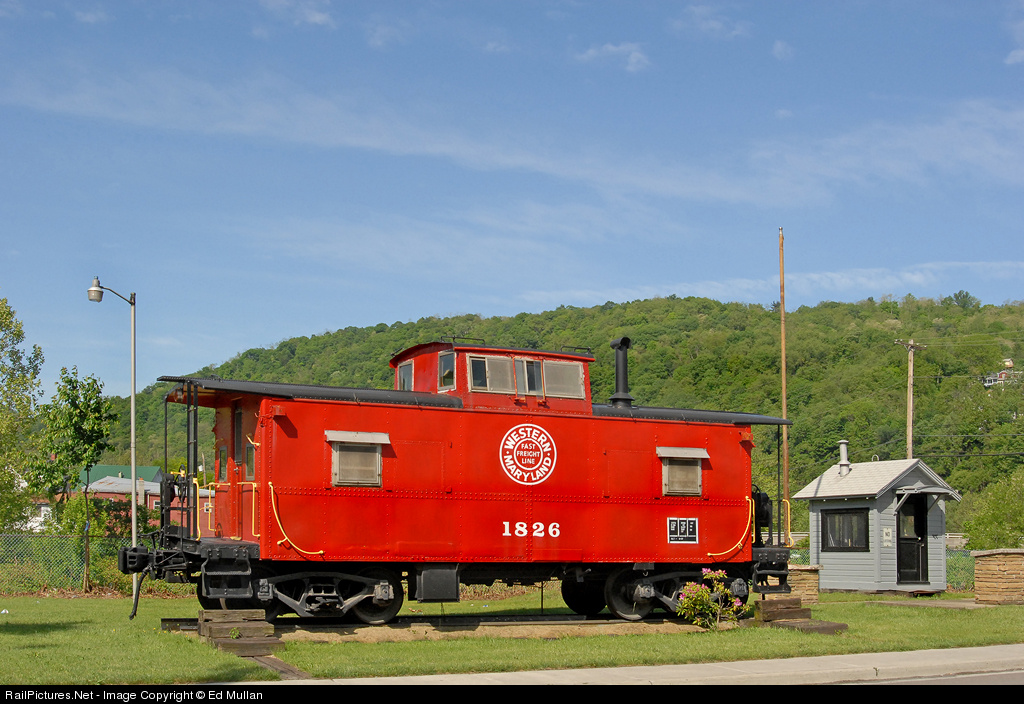 | A group of folks have made a museum out of the old Western Maryland Depot in Westernport, and this well kept WM "northeastern" caboose sets in a park across the street. Note the neat old watchman's shanty in the right background. |