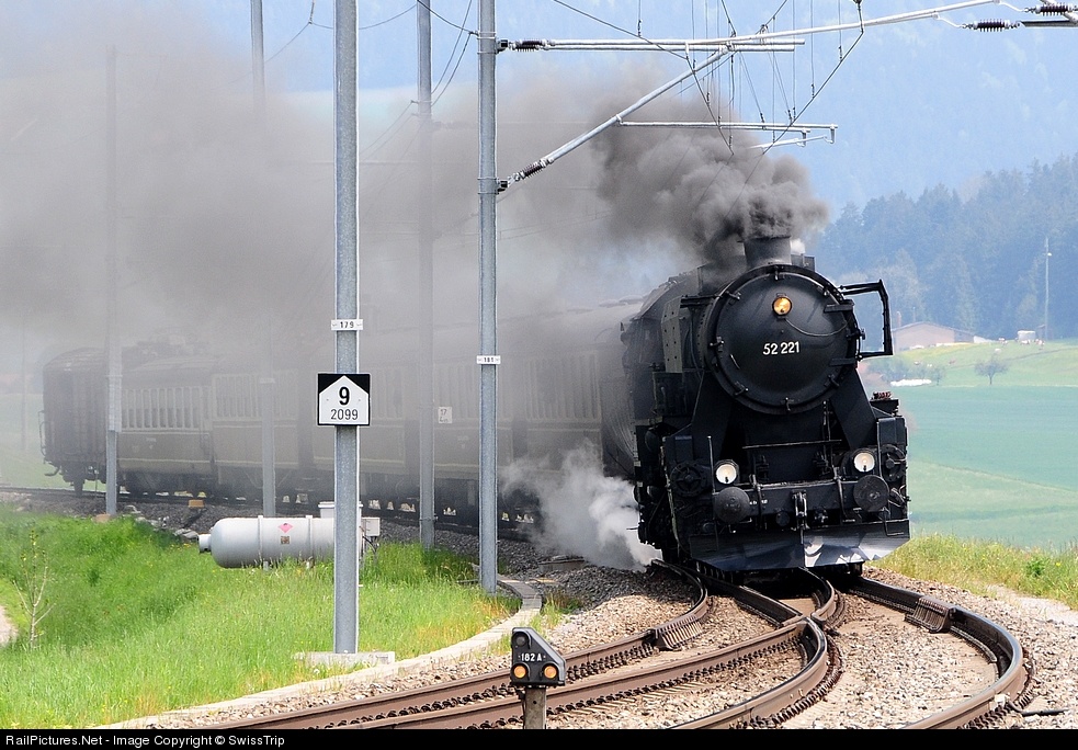 The 52 221 of the Association Vapeur Val-de-Travers/Switzerland on the way home from a steam festival in Interlaken. This unit was built by Skoda in Czechoslovakia in 1944 and was afterwards operated by OBB Federal Railways/Austria. Almost 7000 units were built and were used in the World War II by the Germans in different countries.