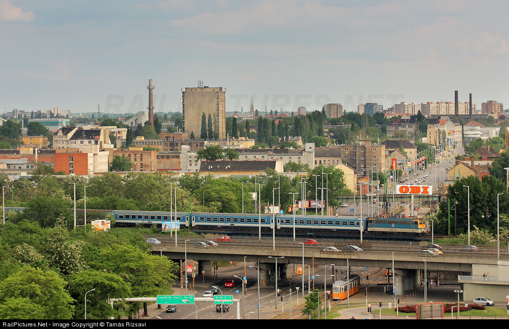 | Sopiane InterCity train is passing over the Soroksári road and goes to Pécs that is Europe's cultural capital. You may see the 9. district of Budapest in the background. The tram which is visible under the bridge, Budapest's one of the most famous tram line is No. 2, which is going on the coast of Danube. It is a popular line which the tourists like who arrive into the capital. |