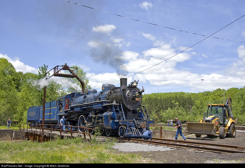 | With not even so much as an inch to spare, the crew confirms #425 is centered on the old CNJ turntable and prepares her for a spin using a CAT front end loader and chain. |