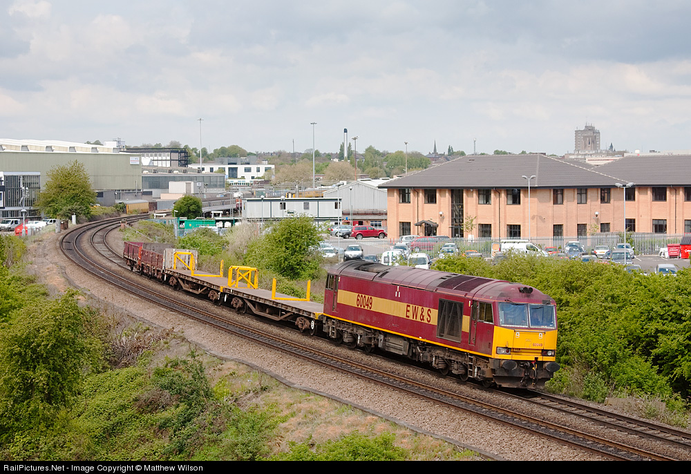 | These days it is rare to see many Class 60 hauled freights, and the curve from Derby to Long Eaton hardly sees freight either. 60049 is captured working a Doncaster to Toton trip working on the rare section of line with the Railway Technical Centre in the background |