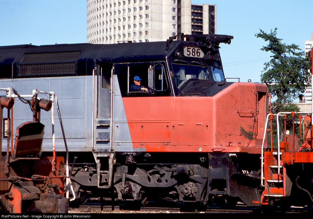 | The engineer of Amtrak SDP40F 586 takes it easy while his locomotive is pushed back to the Union Station for a new job. |