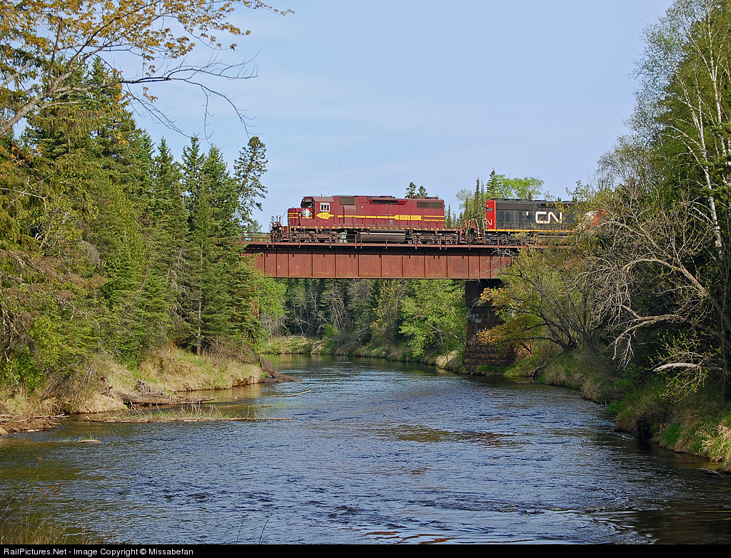 The last Missabe maroon SD38-2 rattles the steel bridge over the St. Louis River on a near perfect morning hauling 93 loads of taconite rock and 2 empties southward.