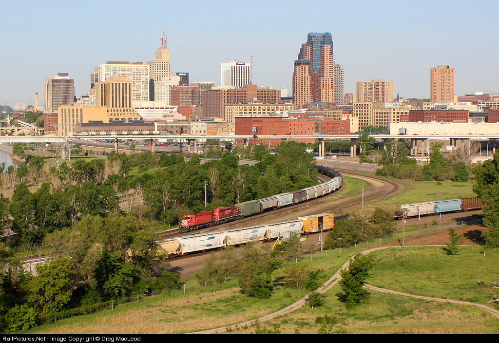 | Mounds Park in Saint Paul offers a number of good vantage points for viewing the parade of trains through the city. This CP transfer will head into Pig's Eye Yard in under a mile. The train in the foreground is a BNSF freight. |