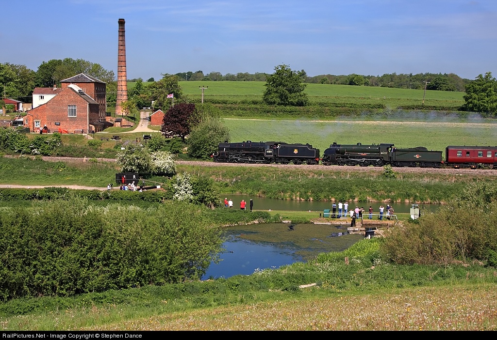 | The Royal Wessex railtour passes the pumping station beside the Kennet and Avon canal at Crofton behind 44871 and 30777. The best weather of the year so far brought out crowds of photographers to this popular spot, although the high temperatures meant little in the way of exhaust from the two locomotives |
