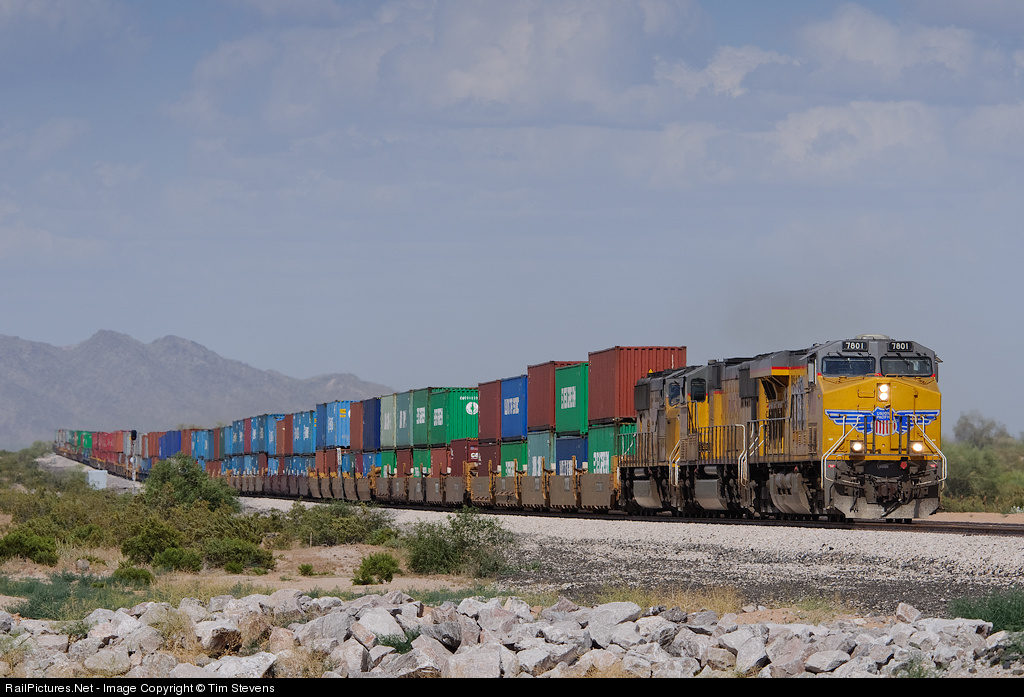 | UP 7801 west approches Estrella with a Long Beach, CA bound land barge consisting of 5 engines (3/2) and 139 intermodal platforms. |