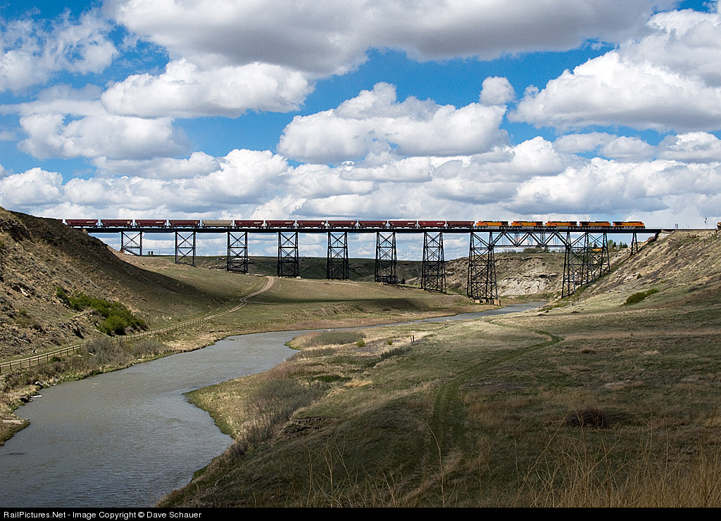 Big Sky - Big Clouds. The clouds parted just long enough to catch this empty grain train with five GEs on the point crossing over the impressive Cut Bank Creek trestle.
