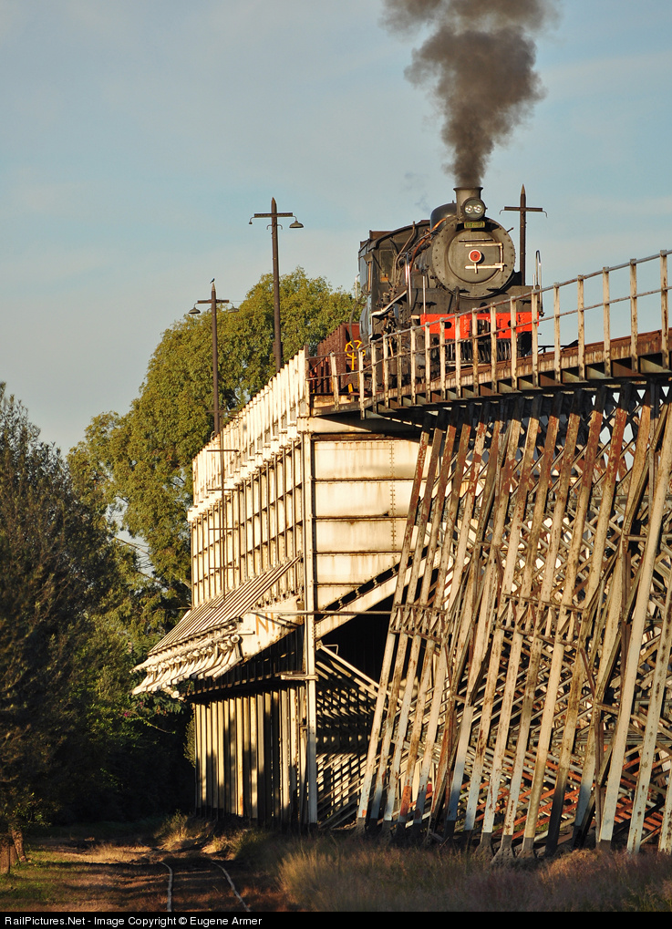 | This is the last operational coal stage in South Africa and is used by Friends of the Rail (FOTR) and Rovos Rail locomotives. FOTR's ex-SAR class 24 poses on top of the stage with two loaded hoppers for a Geoff’s Trains tour group. |