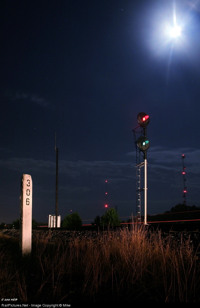 Moonlight shines bright above the ACL target signal at new Hope, SC as the southbound Auto Train lights up the medium clear indication and milepost 306 marker. 306 is the mileage from Richmond, VA.