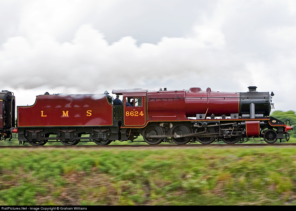 A panned shot of 8F no. 8624 at Burrs, East Lancashire Railway, as it works the 10:00am service from Bury to Rawtenstall. The loco is on loan to the railway for two weeks only. The livery is authentic for an LMS passenger engine, but since this is a freight engine it would have been painted black in LMS days. However, most people agree that it still looks quite attractive.