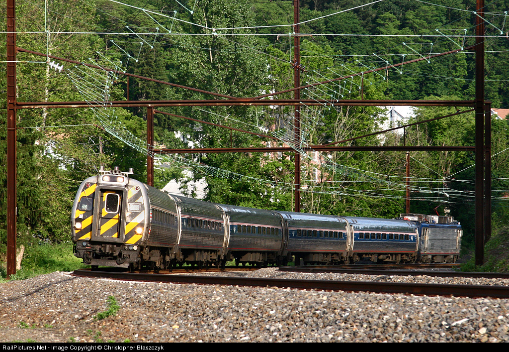 | Amtrak cab car 9638 leans into the sweeping curve at Gap with a westbound Keystone Service train to Harrisburg. Amtrak AEM-7 925 can be seen shoving on the rear of the 4-car train. |