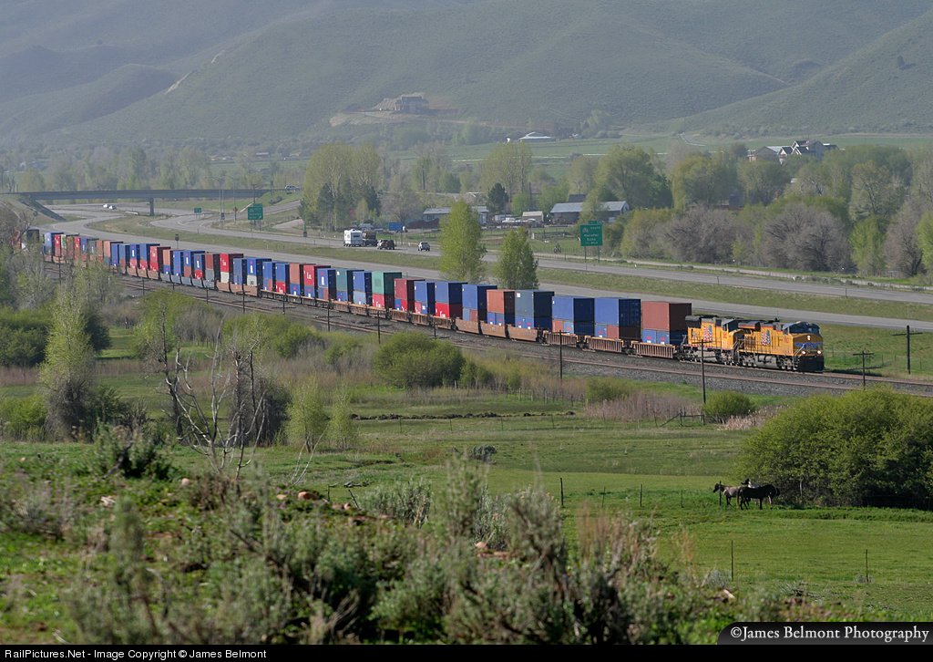 | Coasting downgrade through the Weber River Valley, Union Pacific's Global 2 (Chicago) to Oakland stack train heads west through Henefer. It appears the local equestrian contingent is not all that impressed by UP's display of contemporary horsepower. |