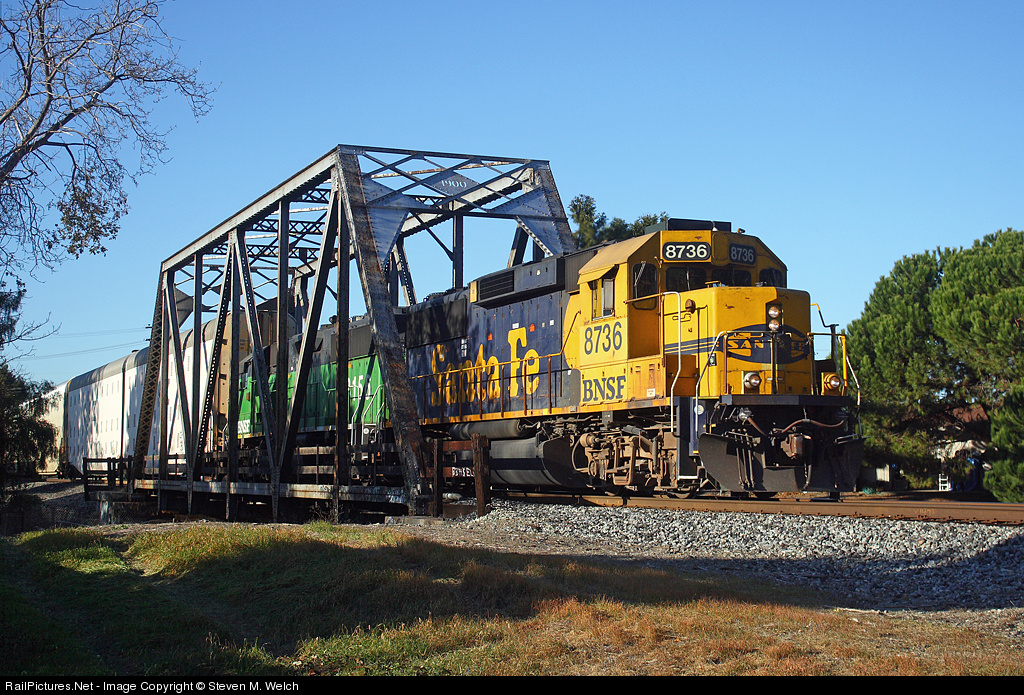 BNSF 8736 leads the Southbound Warm Springs Local across a small truss bridge on a splendid December afternoon.