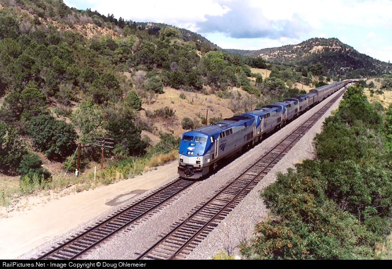| The westbound Southwest Chief rolls through the sidings on the north side of Raton, on the way to its station stop. |