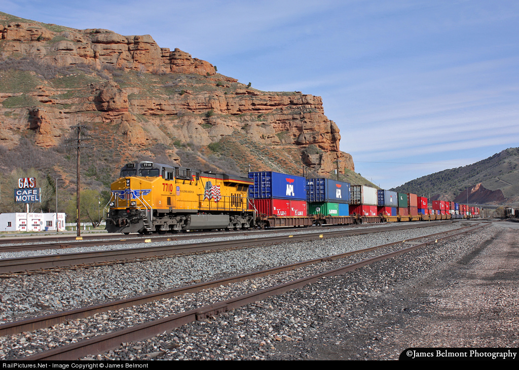 Union Pacific ES44AC #7710 shoves on the rear of a Long Beach, CA to Chicago, IL stack train at Echo, Utah. If you are looking for dining options while passing through this small town, why not drop by the famous Gas Cafe? Service is first come first serve and dining hours are very limited. Hope to see you soon.