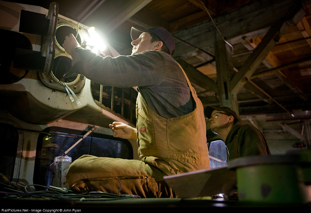 Minnesota Transportation Museum volunteers Phil Wellman (left) and Andy Inserra are working on moving the headlight on MTM's SDP40. The locomotive was delivered with a high headlight as Great Northern 325, but acquired a nose headlight sometime during BNSF ownership. The museum is working on restoring 325 to GN livery.