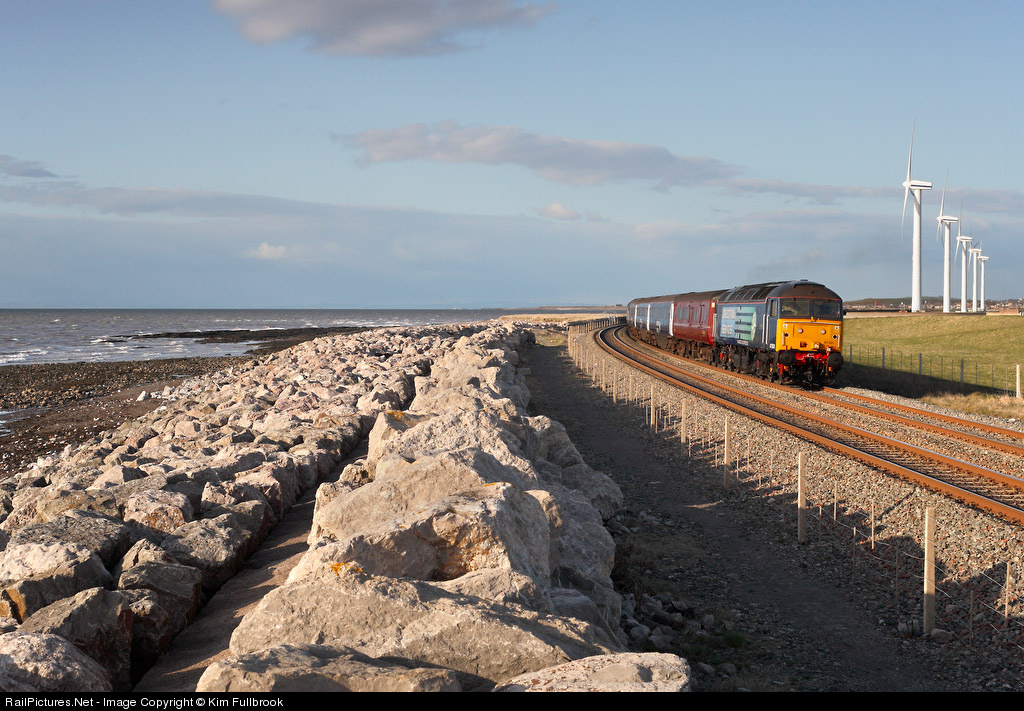DRS 47501 leads the 1820 Maryport-Workington past the wind farm at Siddick near Workington, Cumbria, UK on 20th April 2010. Regrettably these special loco-hauled workings operated only for a temporary period while there was no road bridge over the River Derwent in Workington and the last train ran on 28th May.