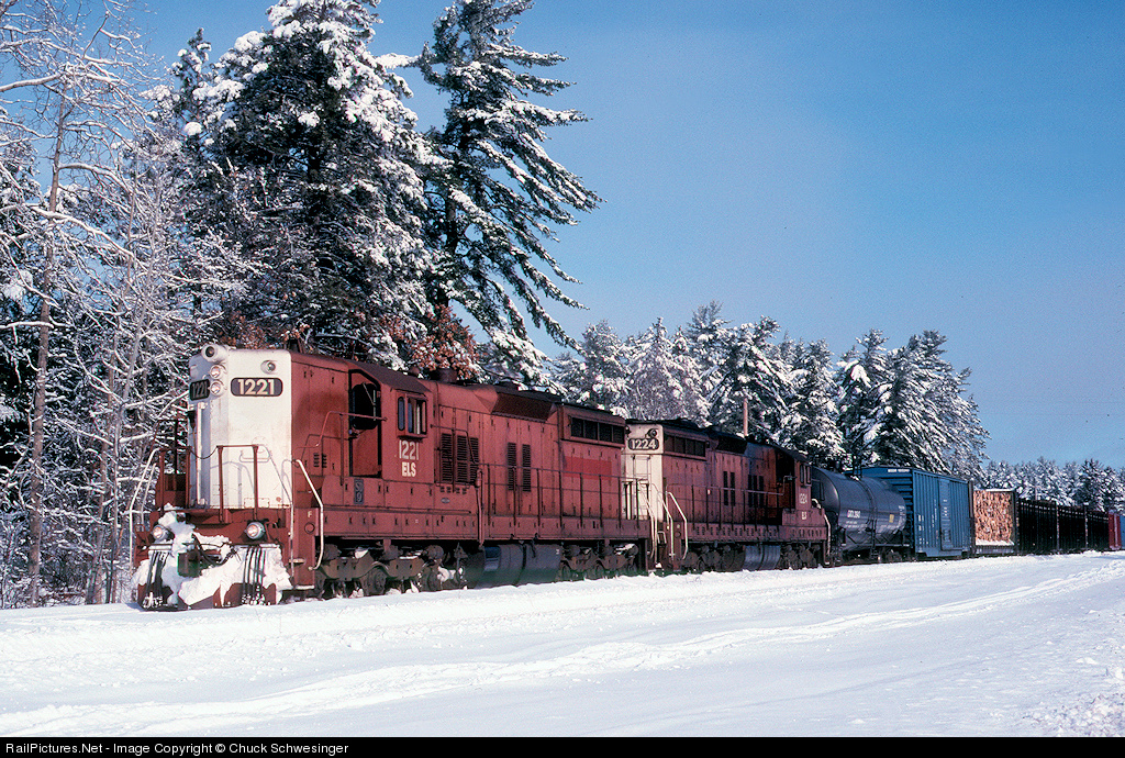 | A pair of E&LS ex Reserve Mining SD9's head the Channing-Green Bay Freight south at Pembine with 30 cars of mainly paper products and logs. The train was making slow head way because of the heavy snow, and 1221 along with 1224 have their work cut out for them. |